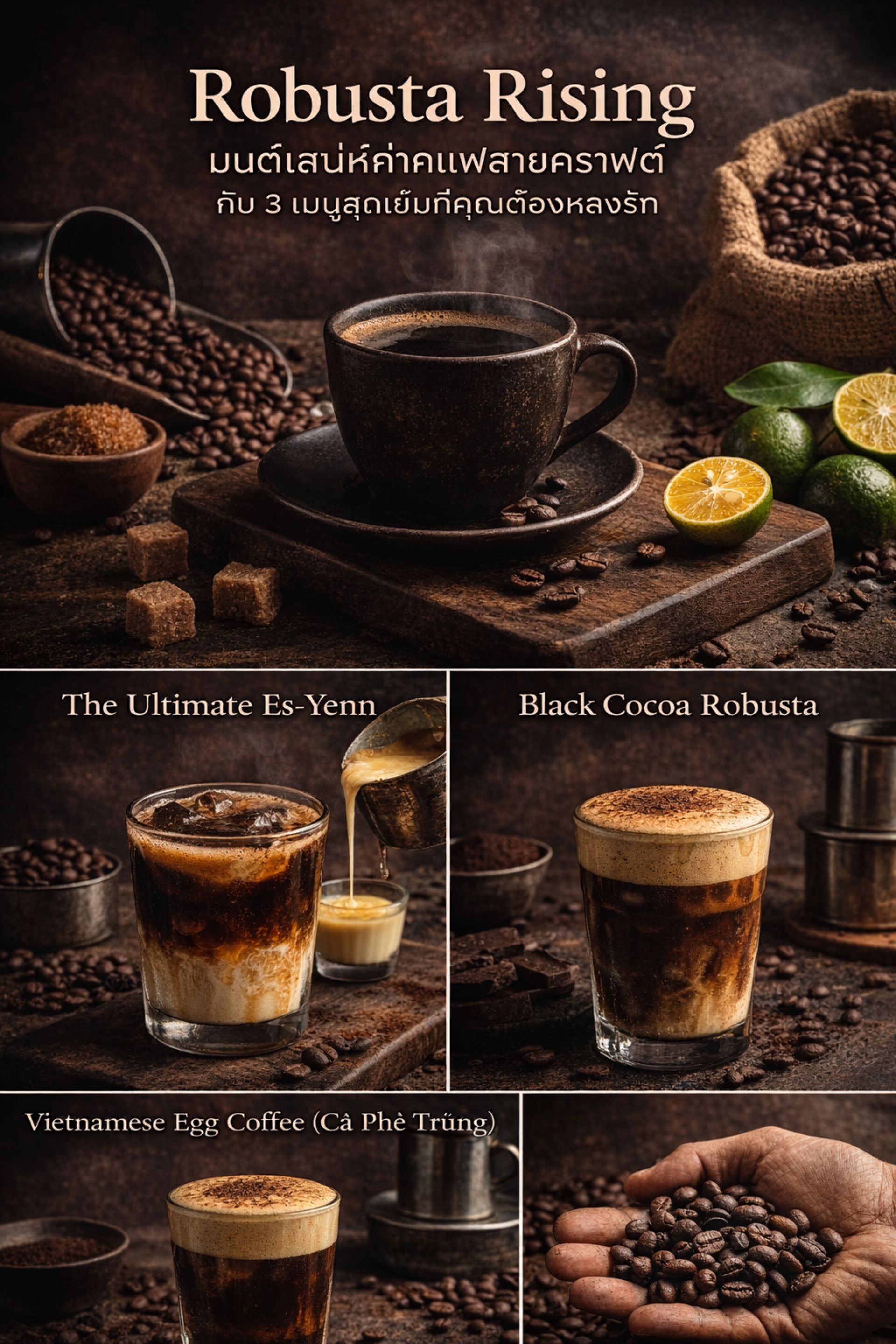 โรบัสต้าคั่วเข้มไม่ใช่กาแฟเกรดต่ำ แต่เป็นกาแฟที่มี "จิตวิญญาณ" ของความแข็งแกร่ง เมนูที่นำเสนอไปทั้ง 3 เมนูนี้จะช่วยชูจุดเด่นของโรบัสต้าให้เปล่งประกายที่สุด ไม่ว่าจะเป็นความนัวในแบบเอสเย็น ความดาร์กใน Black Cocoa หรือความหรูหราในกาแฟไข่
